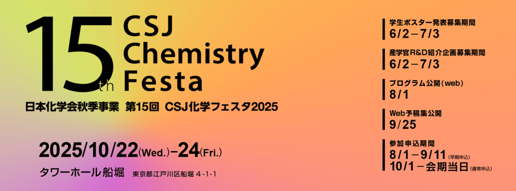 第15回 CSJ化学フェスタ2025(2025年 10月22日-10月24日@タワーホール船堀)で、以下 1件の発表を行いました。